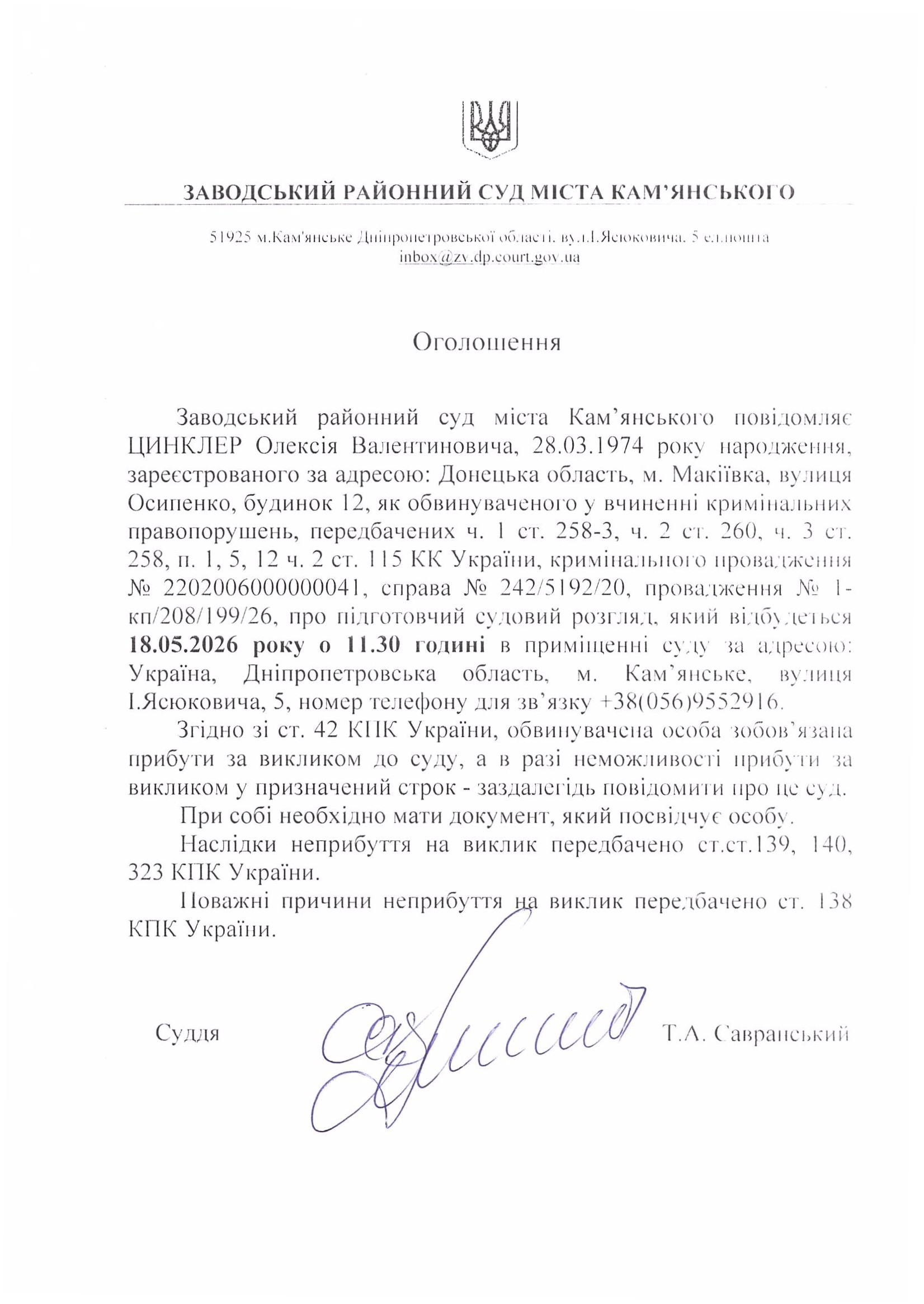 Викликається Цинклер Олексій Валентинович